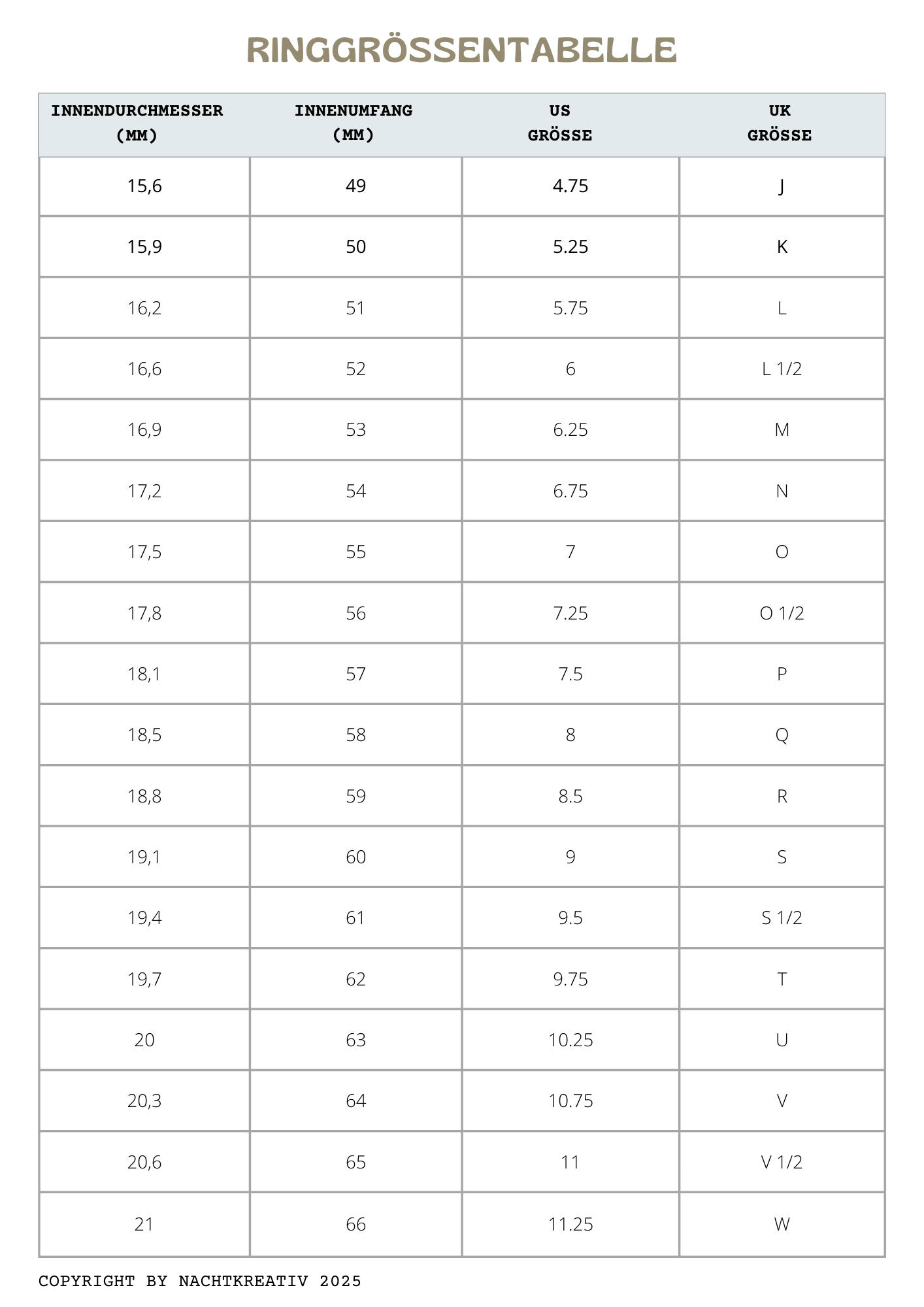 Bei NachtKreativ gebe ich die Ringgröße normalerweise in Millimetern an und beziehe mich damit auf den Fingerumfang. Auch bei der Bestellung eines Perlenringes trägst du deine Größe in Millimetern in das entsprechende Feld ein.