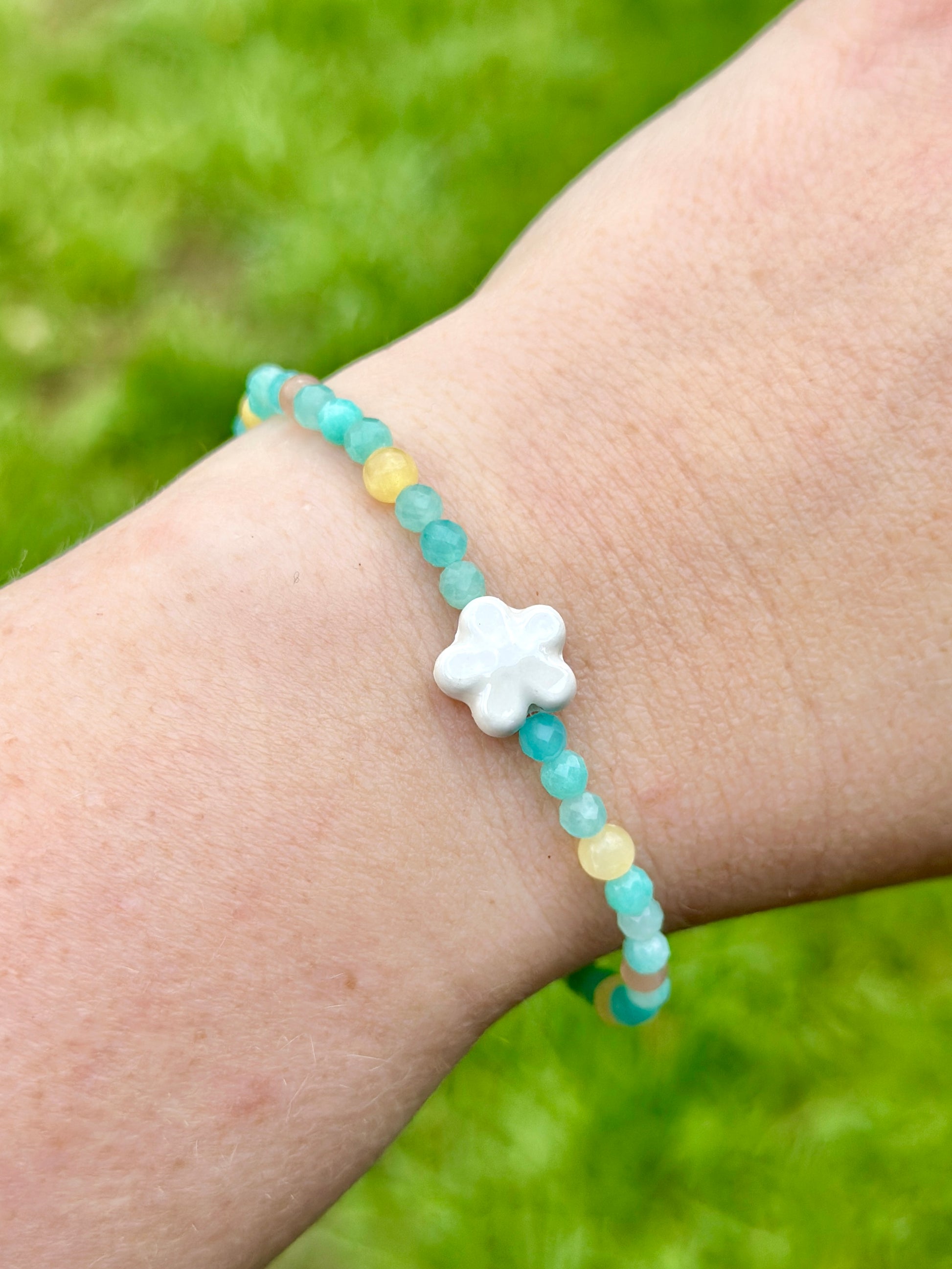 1x Wunscharmband Keramikblume mit 4mm Amazonit facettiert, gelber Calcit und Pfirsichmondstein, 18cm, 18€