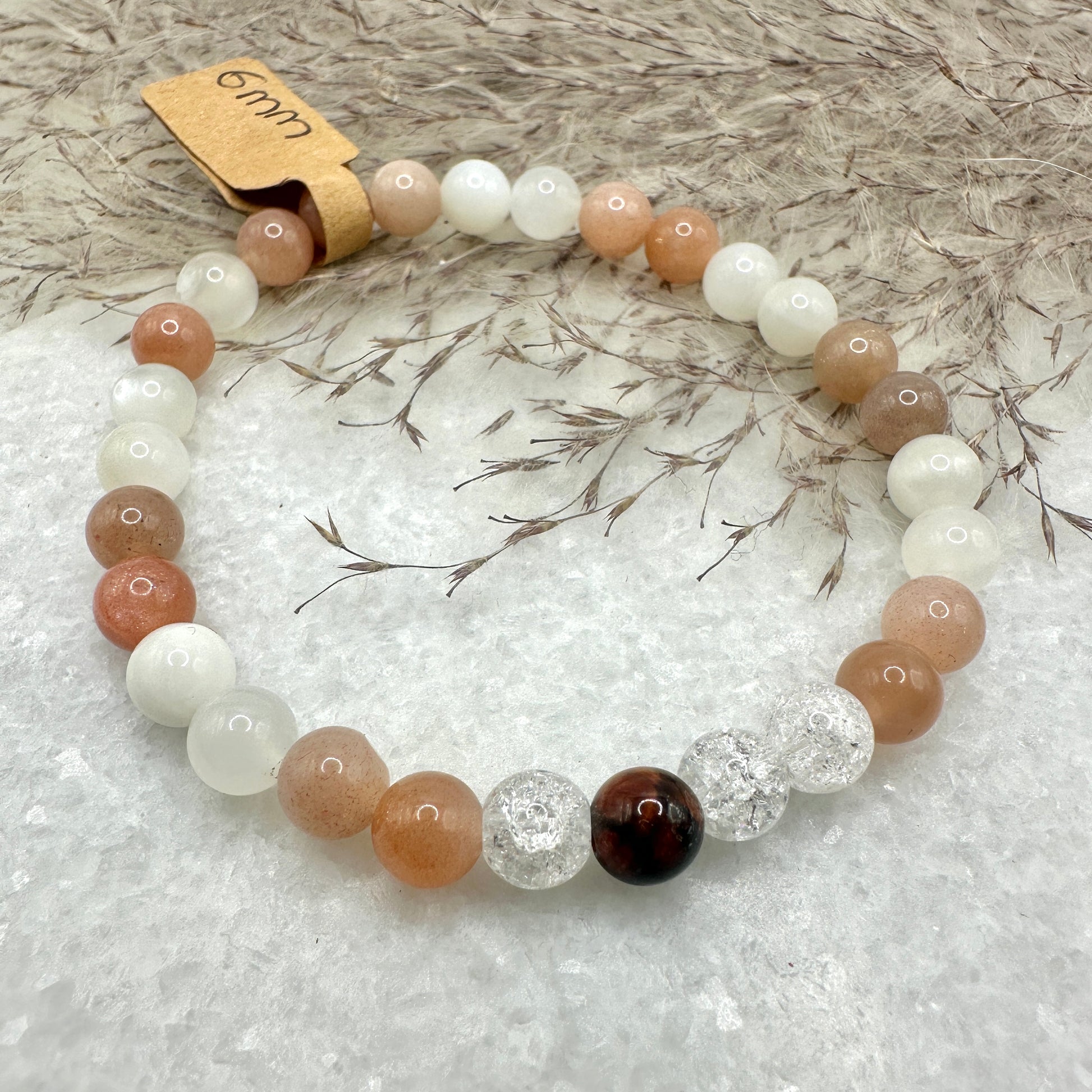 - 6mm Perlen Mondstein, Tigerauge und Bergkristall ("Crackle Quarz")