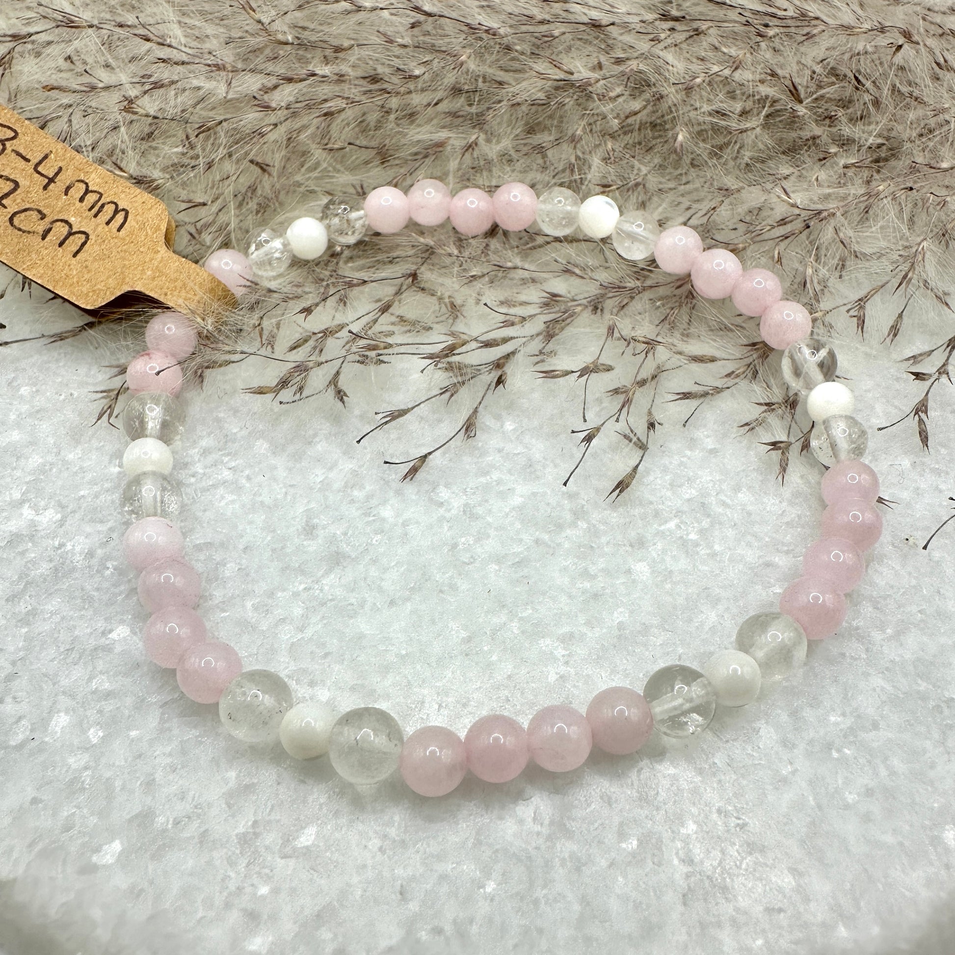 - 3-4mm Perlen Rosenquarz, Perlmutt und Bergkristall