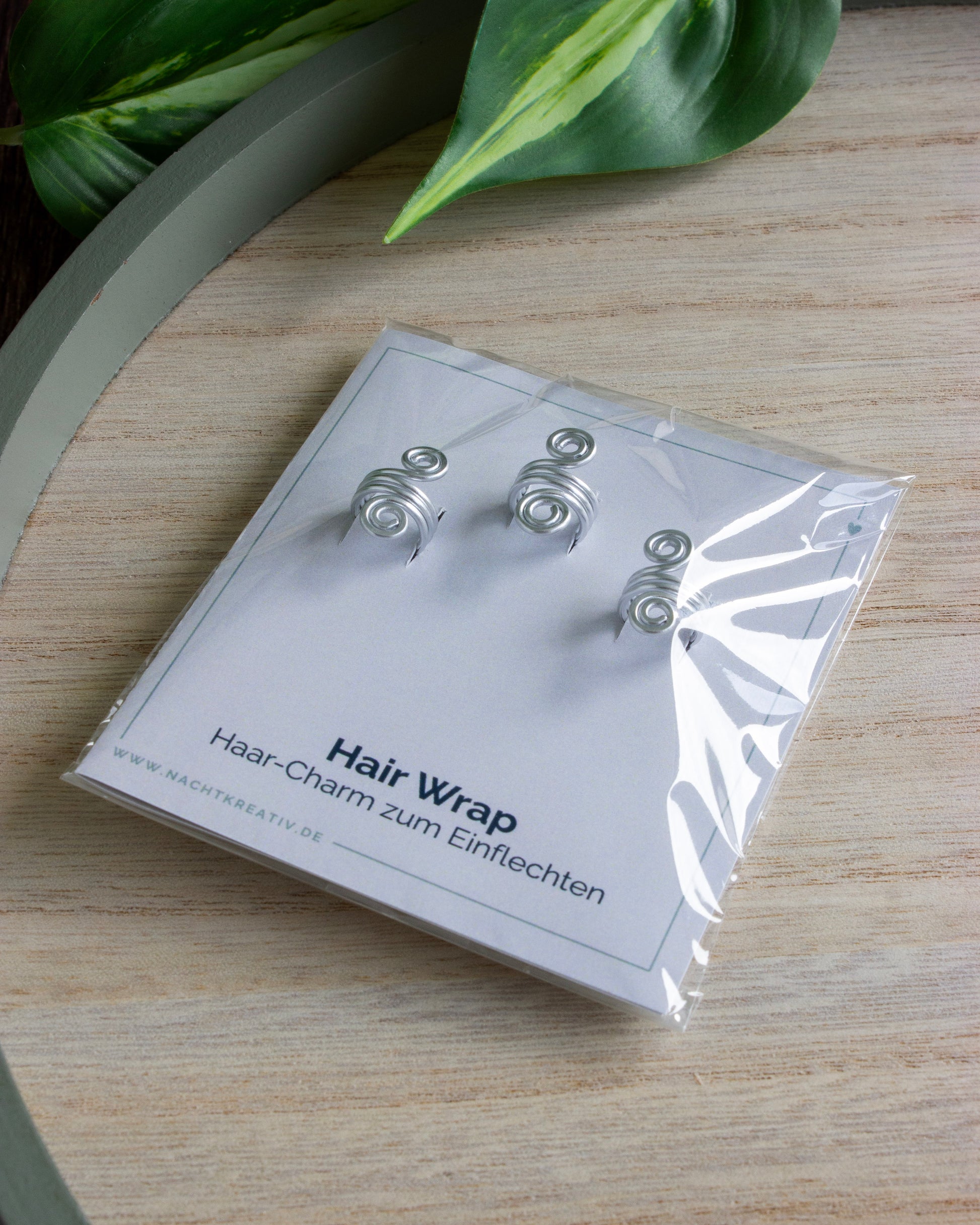 Jeder Wrap wird von mir sorgfältig aus federleichtem Alluminiumdraht gefertigt, teils mit Edelsteinen oder Charms kombiniert und so geformt, dass er sich mühelos ins Haar eindrehen lässt.