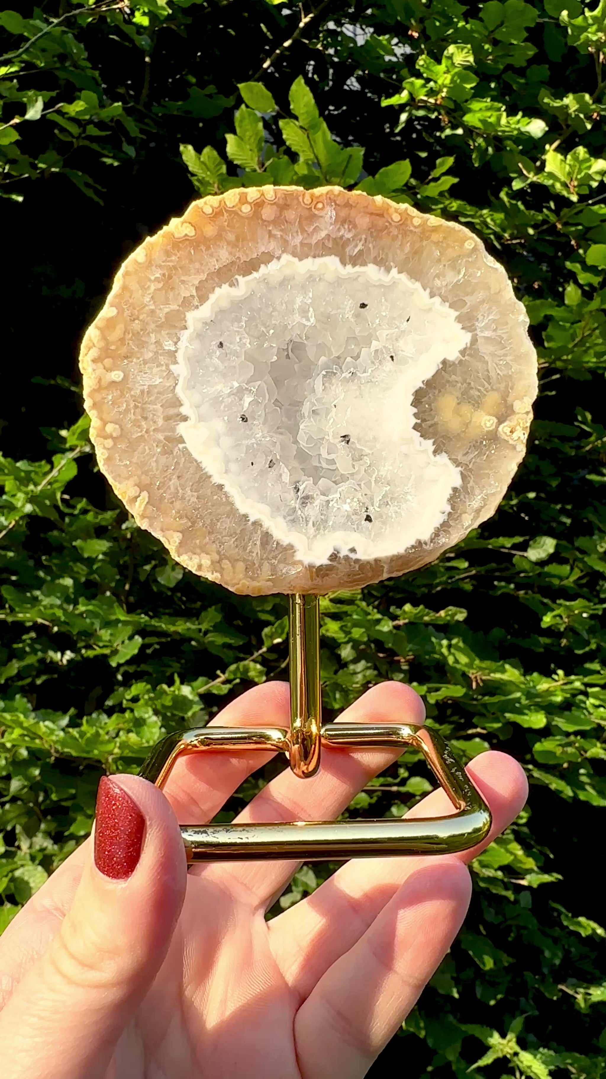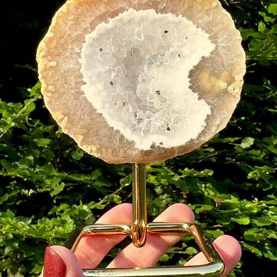 - Halbe, polierte Achatgeode mit Chalcedon auf Ständer