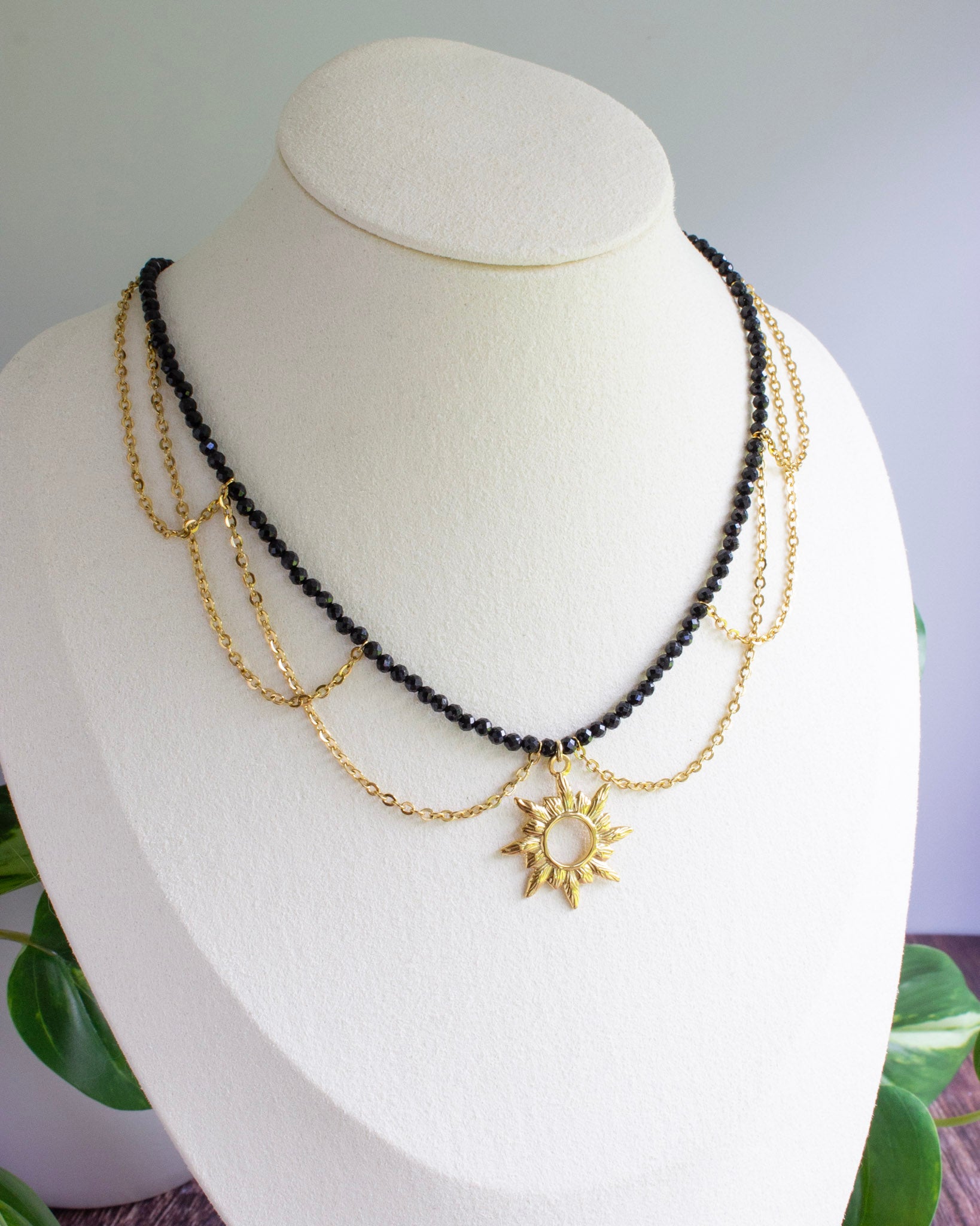 Goldene Ketten umrahmen schwarzen Turmalin, der für Schutz und Erdung steht. Wie das Licht, das durch Dunkelheit bricht, vereint Helia strahlende Eleganz mit tiefer Symbolik.